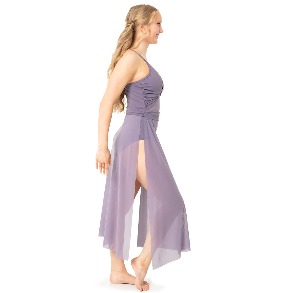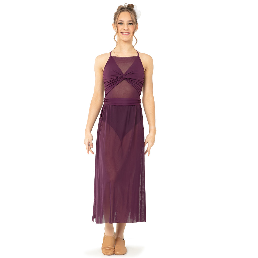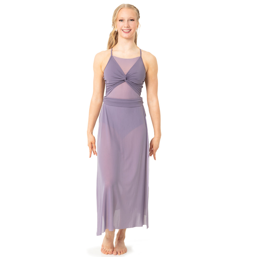 This twisted front lyrical dress includes a unique twisted front bodice with mesh underlay, a gathered waistband, and a midi-length mesh skirt with slits at the side seam. The back includes criss cross adjustable straps and lining under the mesh panels.