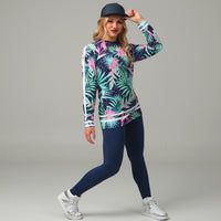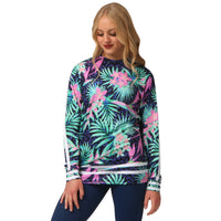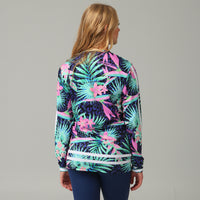 Long Sleeve Hip Hop shirt that is sure to turn heads at your next competition. All over dye sublimation graphic print design inspired by the congo tropical forest, accented with sporty stripes. Crew neckline, relaxed fit. Birdseye mesh.