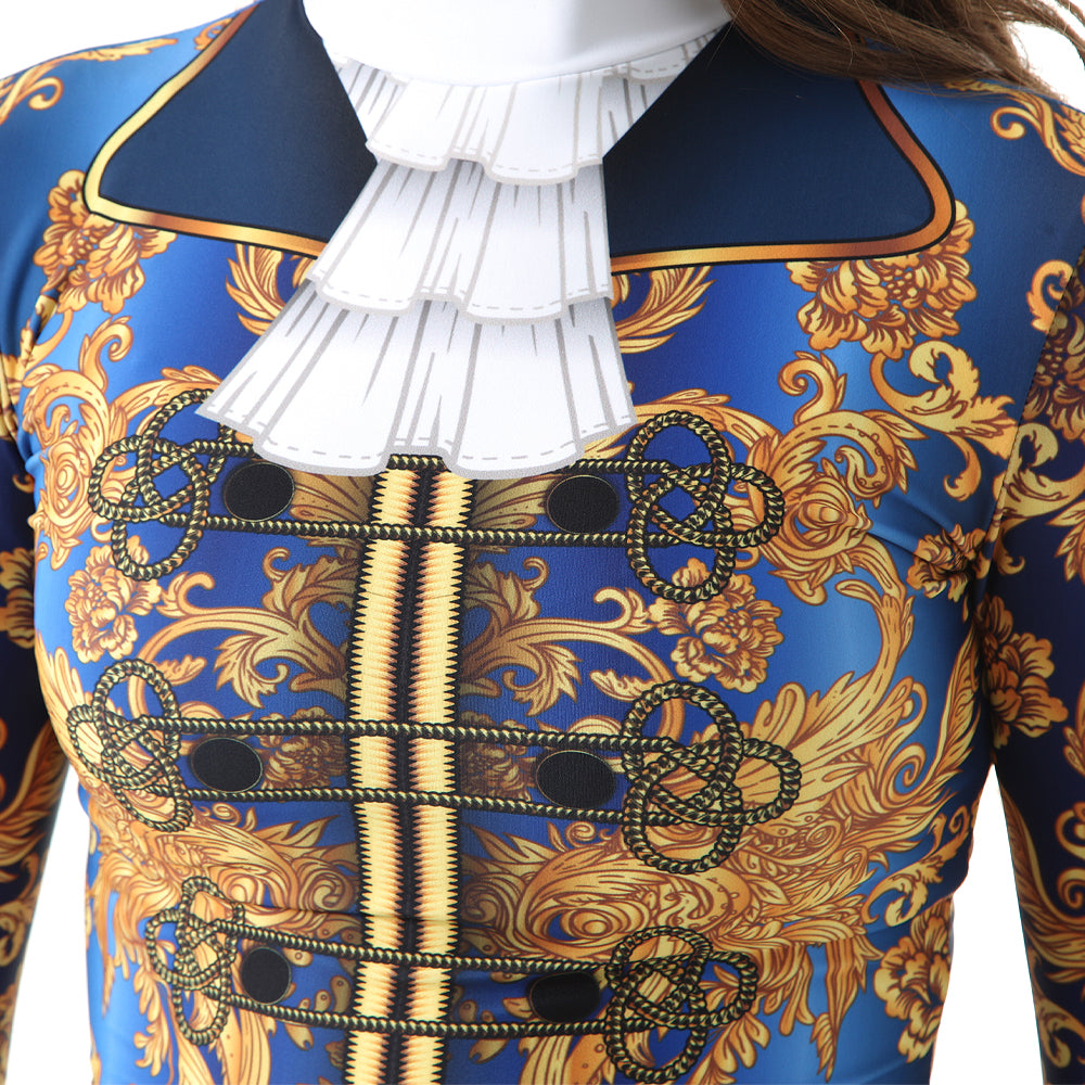 Alexandra Costumes are designed with dancers comfort and uniuque style in mind. The Hamilton Biketard is a realistic colonial inspired biketard featuring ruffled sleeves, cravat neckwear, and floral baroque overcoat. Mock neckband. Center back zipper. Polyester, Spandex. Available in youth and adult.