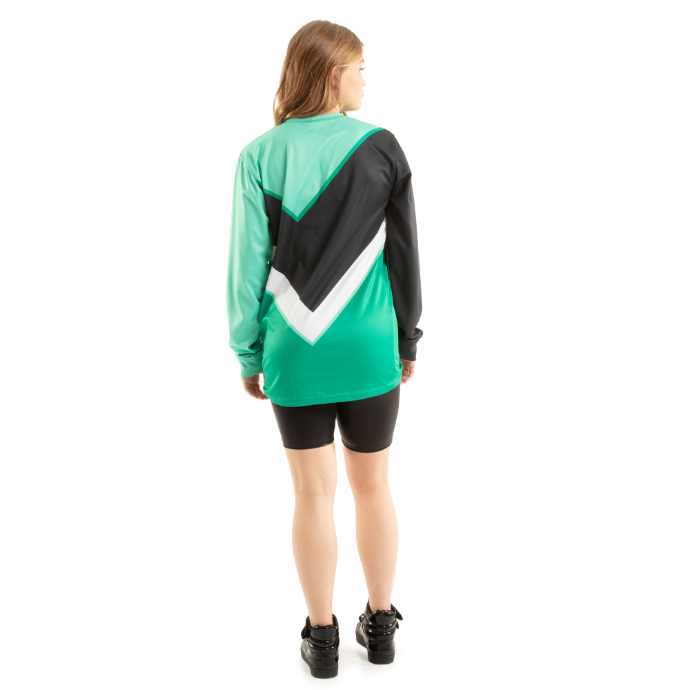 Asymmetrical chevron multi-teal hued colorblock panel long sleeve shirt. Birdseye Mesh, Polyester.