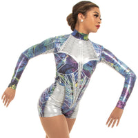 Style lines and laced details on biketard and underneath sleeves add the extra sheen/touch to this futuristic biketard. Long sleeve mock neck biketard. Full front lining and center back zipper. Made in the USA. Polyester, Spandex.