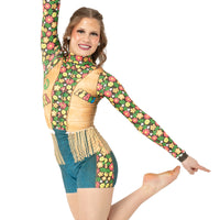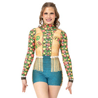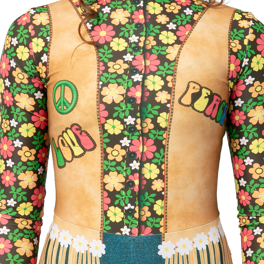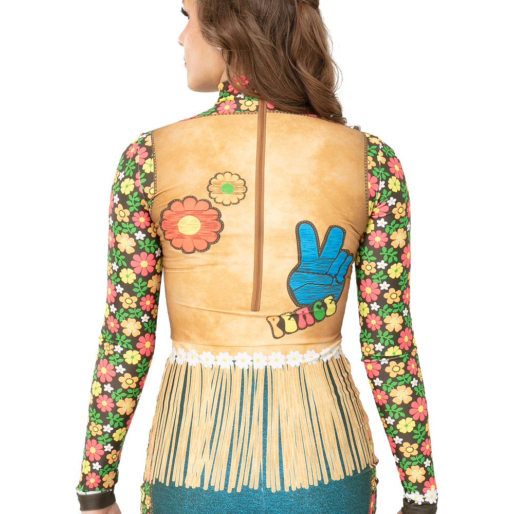 You'll look like you are ready to spread peace, love and happiness once you get the party started in this realistic hippie inspired biketard. From the vintage floral pattern to the iconic leather fringe vest that features peace and love patches. Full front lining and zip center back closure. Polyester, Spandex.