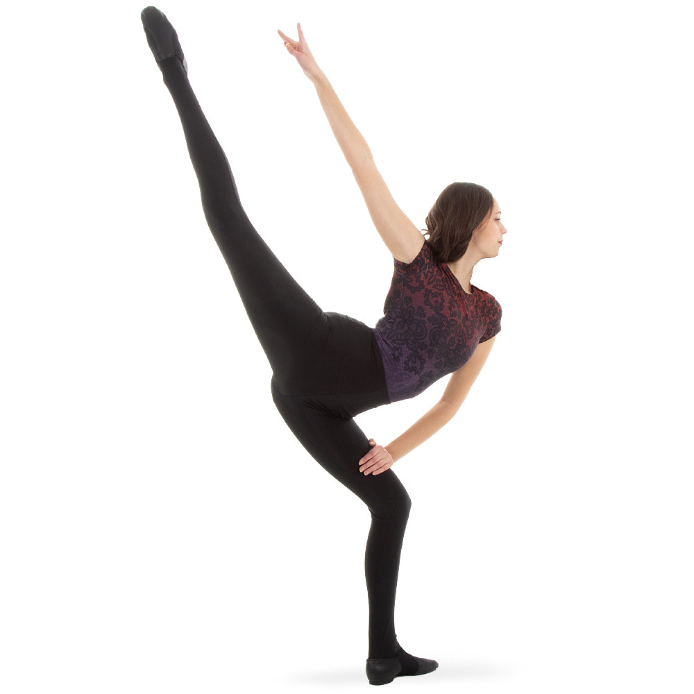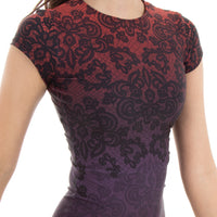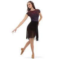 Blow the audience away in this whimsical cap sleeve biketard. The floral print and ombre color adds to the light-heartedness of the costume. Circle neckline, open mesh back panel. Center back zipper closure. Fully front lined. Polyester, Spandex.