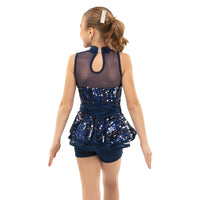 This dazzling sequin biketard features an unique sequin bodice and skirt. There is an upper mesh sweetheart panel and upper keyhole back panel with a neckband g-hook closure. Stretch tricot shorts. Lined bodice.