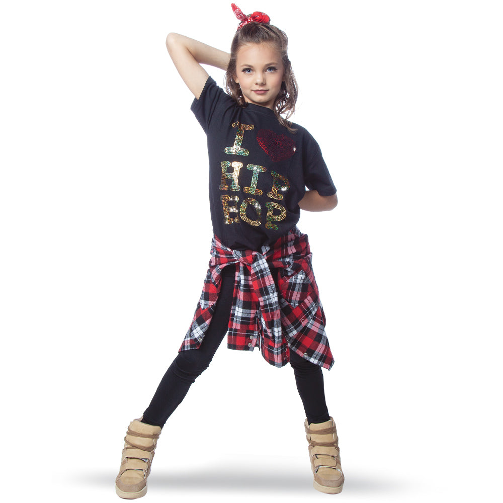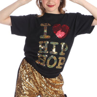 This Sequin I Love Hip Hop dance T-Shirt is perfect for street wear and dance wear. This versatile tee can be worn to school or paired with a fun pair of leggings to create the perfect outfit.