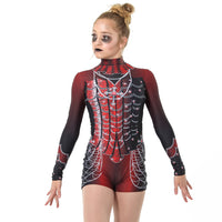 Embrace a world of mystery and allure and have all eyes drawn to you in the long sleeve mock neck Midnight Vampire Biketard. With dye-sublimated photorealistic features including a corset-like front, jewel pendants, and fake rhinestone spiders that will have you dancing out of the crypt. Zip-up back. Polyester, Spandex.
