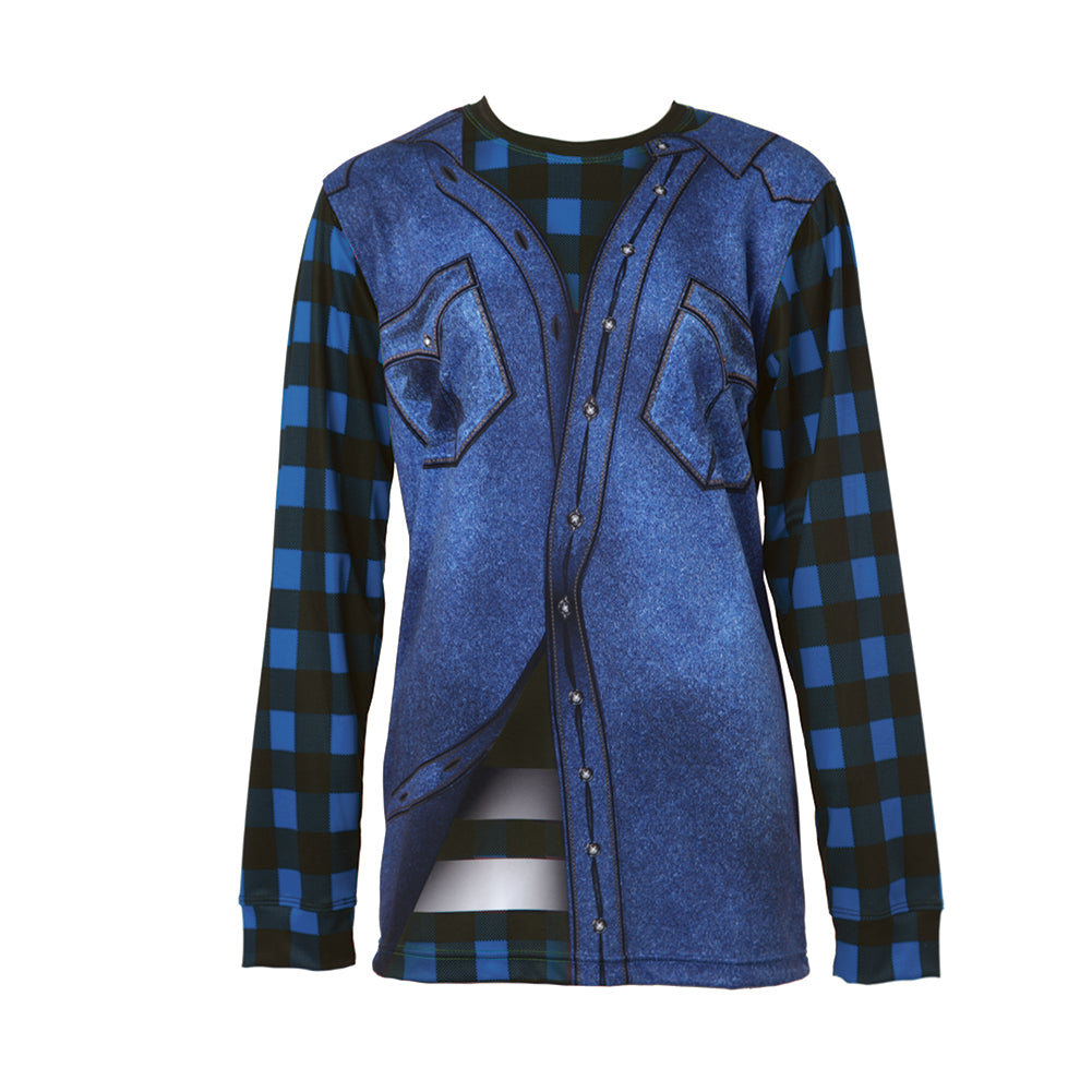 Long sleeve dye-sublimated plaid shirt with a realistic denim vest layered for the ultimate hip-hop look. Coolever Birdseye Mesh.