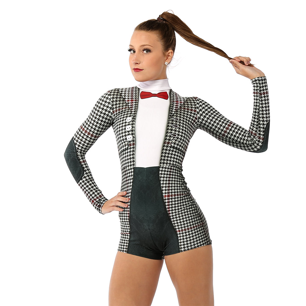 Long-sleeve biketard with a mock neck collar. Features many realistic features including a subtle striped white shirt, tweed jacket with leather elbow patches, and to top it off, a red bow tie. Zip-up back.
