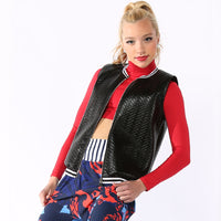 Show off your sporty side with the Alexandra Collection Athletic Varsity Pleather Vest. Featuring a stripe ribbing hem and collar, full front zipper, and semi- relax fit. The fabric stretches where you need it and moves comfortably with you while looking trendy. Mix, match, and layer for the ultimate outfit.Ā