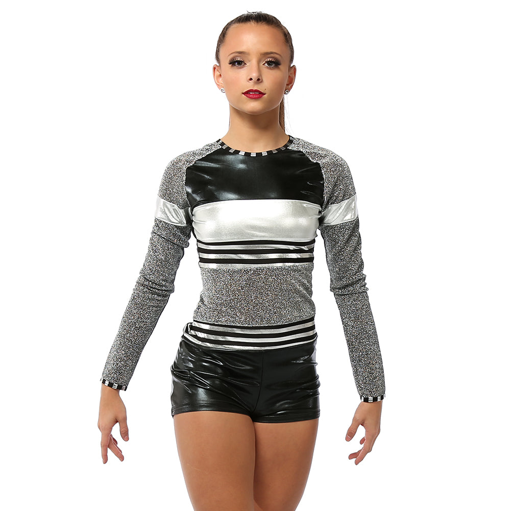 Long sleeve performance biketard with multiple show-stopping accents, including a sparkling silver and black metallic knit mesh fabric on the middle bodice panel and sleeves, and ever-trendy printed metallic stripes on a tricot fabric to top it off. The color blocking panels that make up the biketard consist of black and silver metallic stretch knit foil. Both fabrics stretch lengthwise and crosswise and have a smooth hand feel so it moves comfortability with the body.