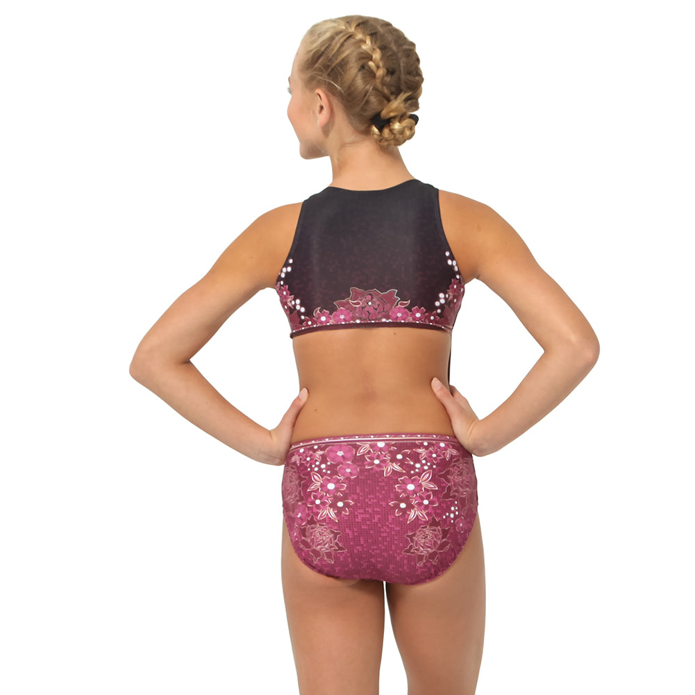 This Romantic zipper front cranberry colored leotard features artistically placed jeweled flowers and pearls that create a slimming effect. Open lower back design with full front and back lining. Polyester, Spandex.
