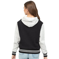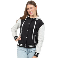 Snap front closure. Contrast sleeves and unlined hood with flat woven drawcord. Striped knit cuffs and waistband.Ā