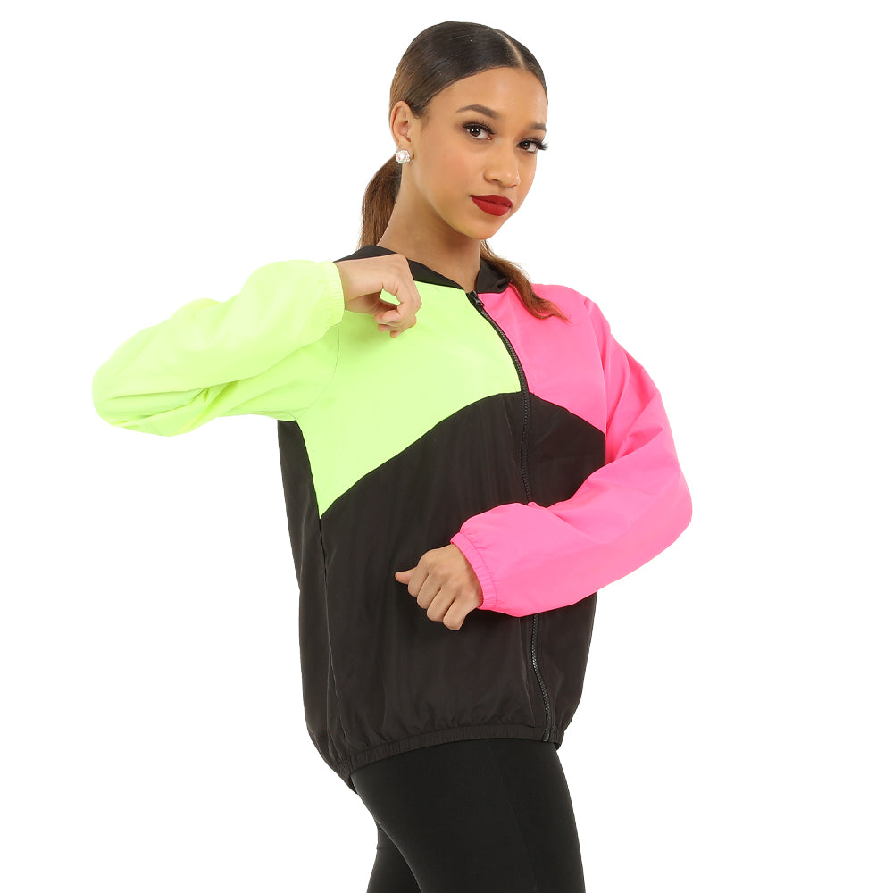 Full zip hooded windbreaker jacket feature two different upper front neon panels and a black lower panel. Two tone sleeves and contrasting back. Side slit pockets and elastic at sleeve hem and jacket hemline. Nylon, Spandex.