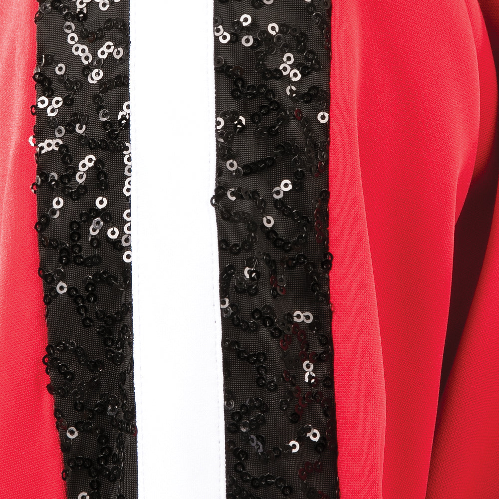This full zip hooded knit jacket features a sequin and solid stripe detail on the sleeves. Solid knit hood. Enclosed elastic cuff and hemline.A smooth interlock knit fabric.