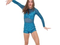 This romantic long sleeve biketard features sequin tricot panels, and stretch mesh panels with a keyhole mesh back. G-hook closure. Fully lined under sequin panels. Enclosed elastic lining around leg opening for comfort.