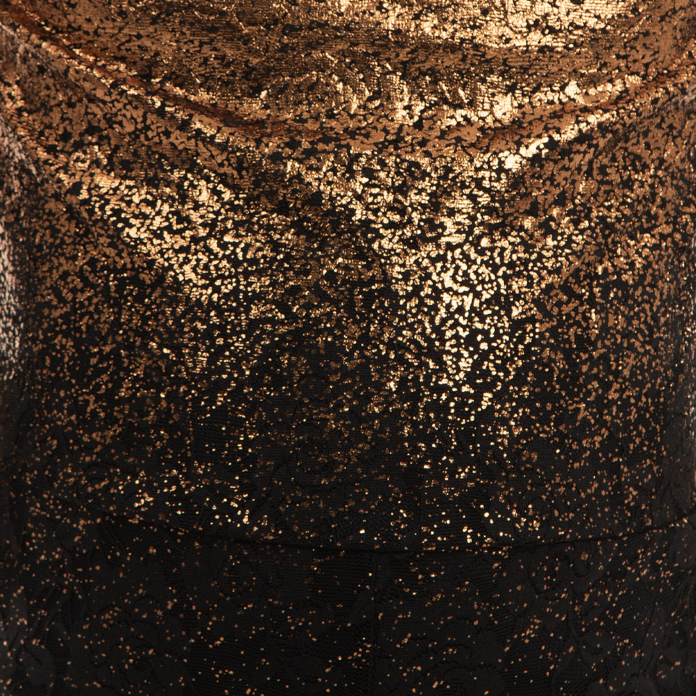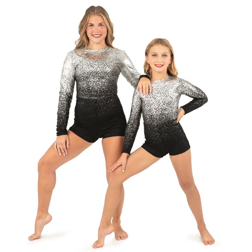 This black tricot biketard features a copper-colored foil cascading design that is perfect for any style of dance. Long sleeve, circle neckline and a center back zipper closure