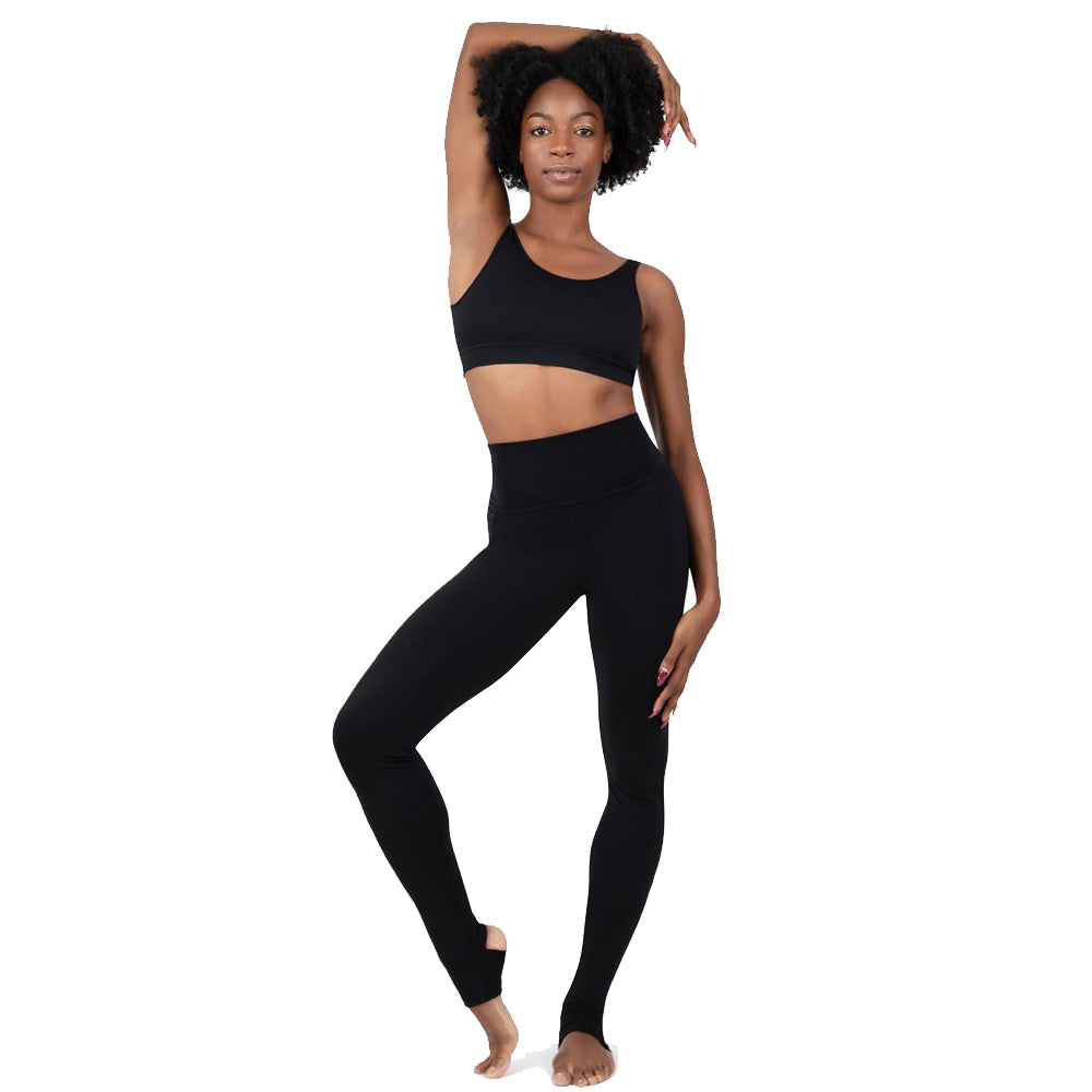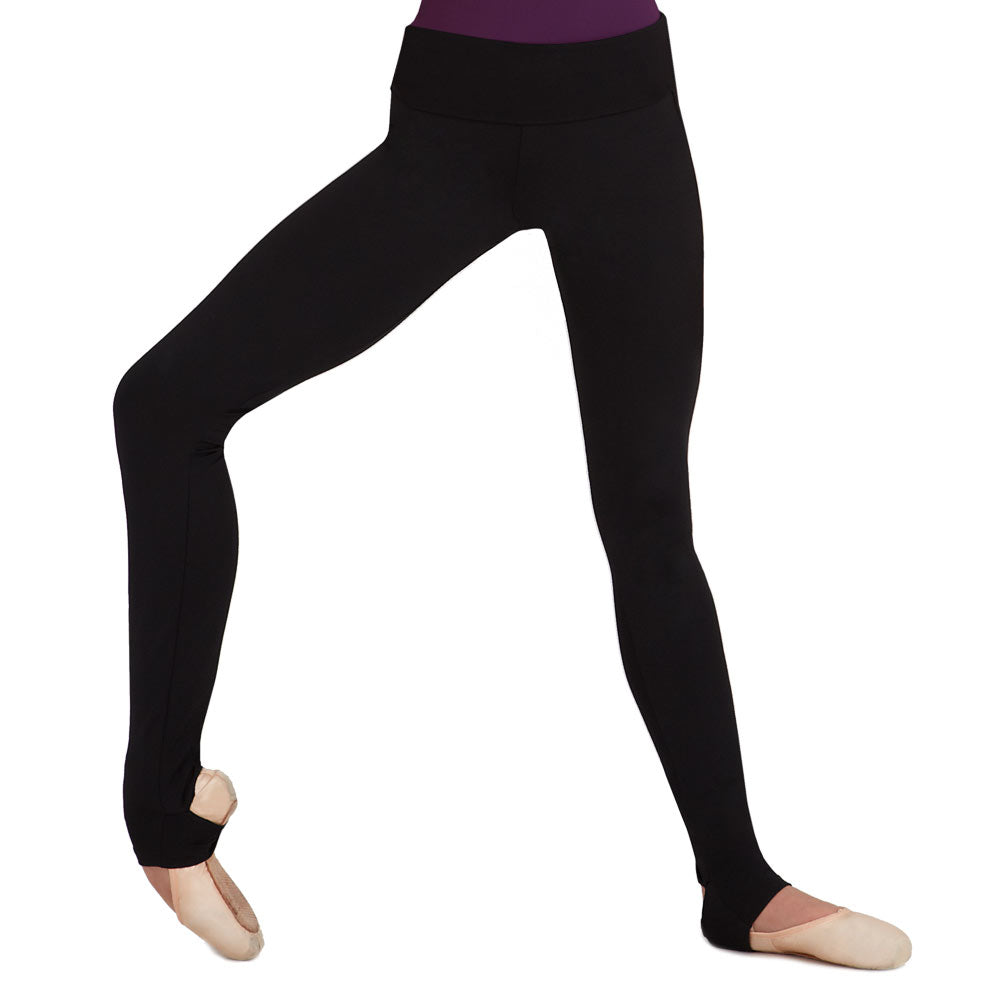 Capezio. Essential high waist, basic legging with stirrup. Can be worn as regular legging (with a stirrup hole creating a cut-out detail on calf) or with stirrup worn in down position. Perfect ballet basic.