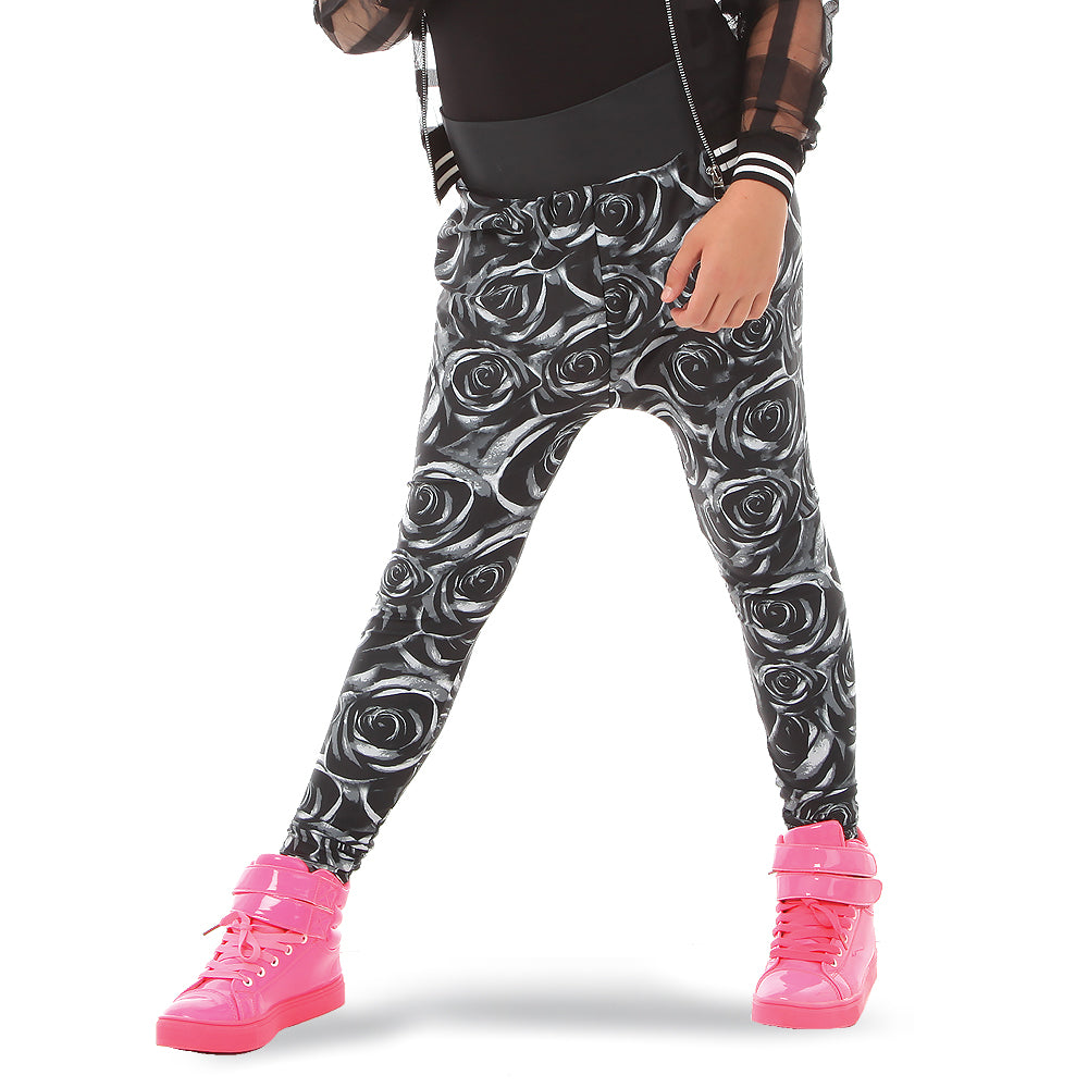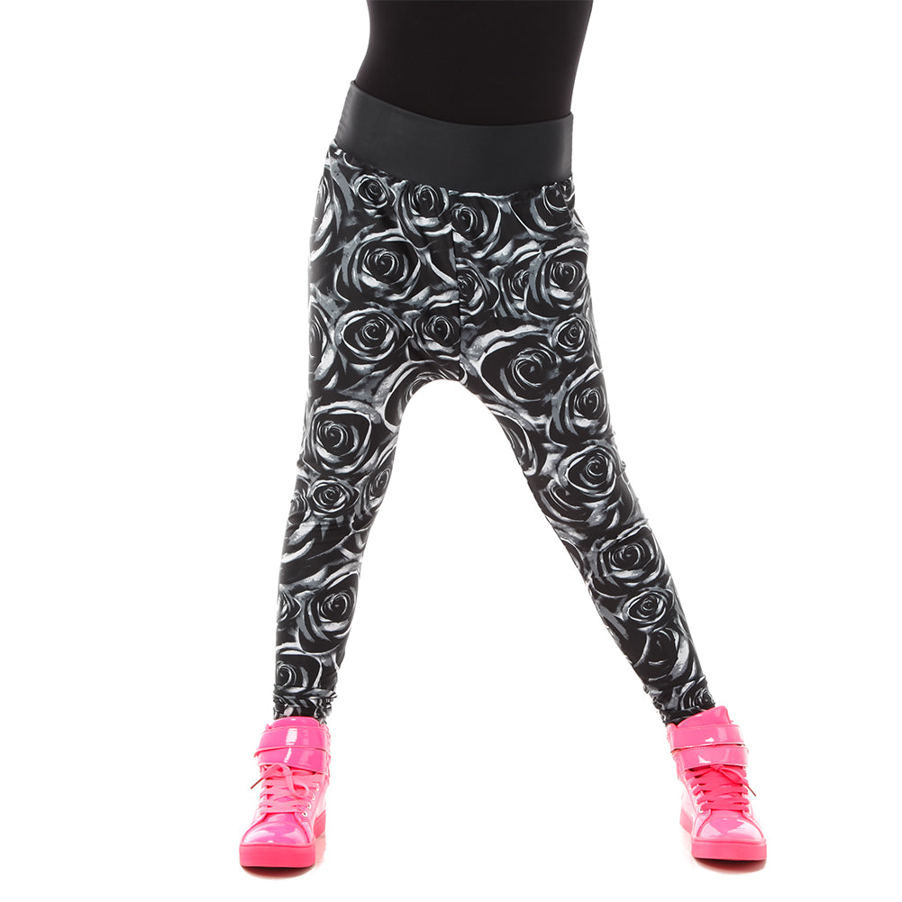 Flashy and fun harem pants are comfortable, flexible, and the fit is second to none. All-over black/grey rose print design. Higher waist styling.