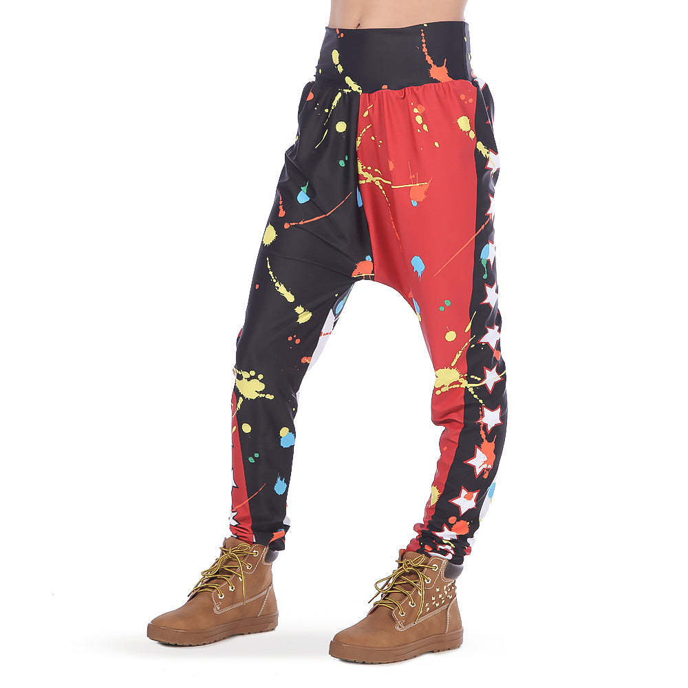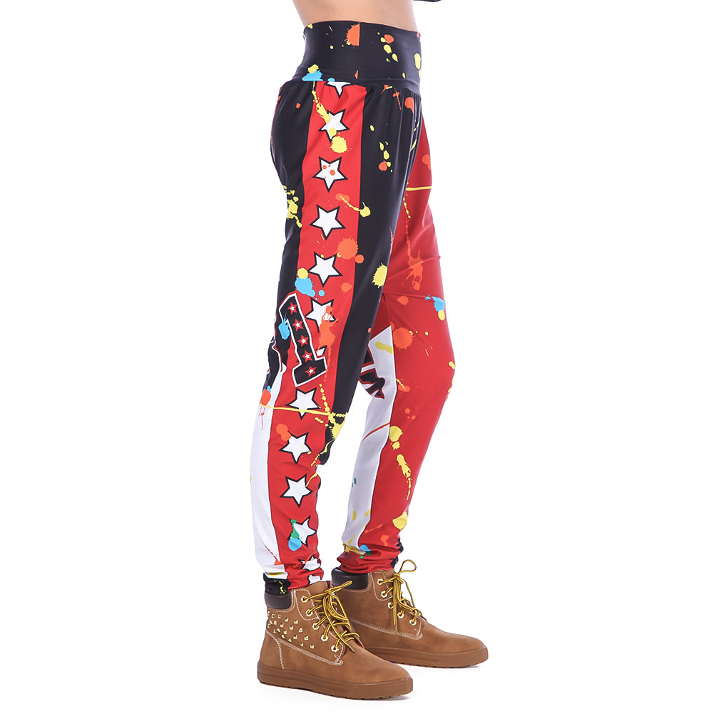 These harem pants are legit from the high waist to the ankles. All-over paint splatter print on the front and back with the words "legit" and number "81" on the back. Polyester, Spandex.