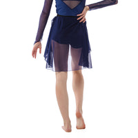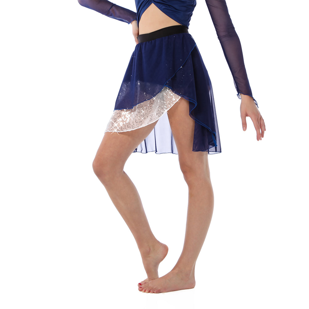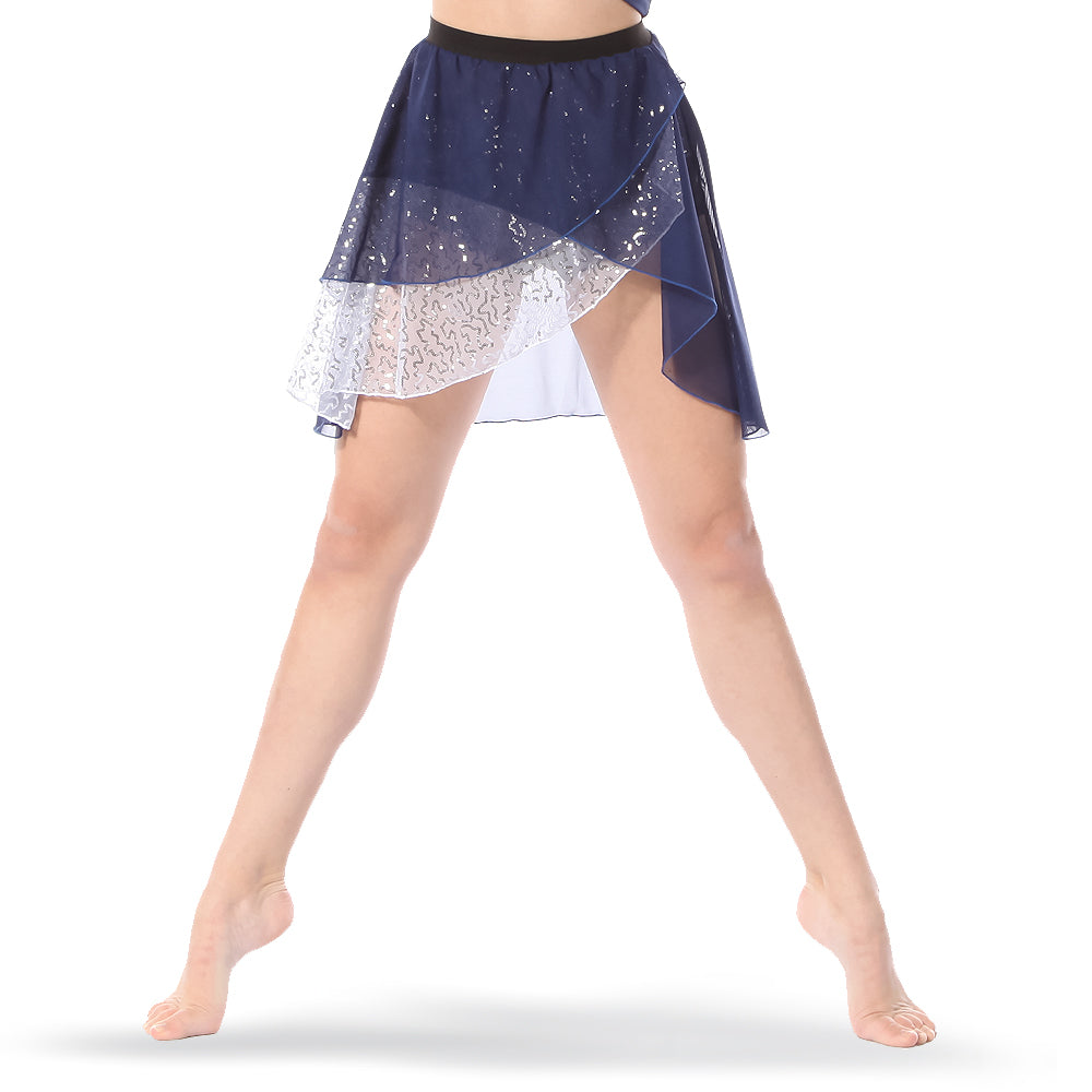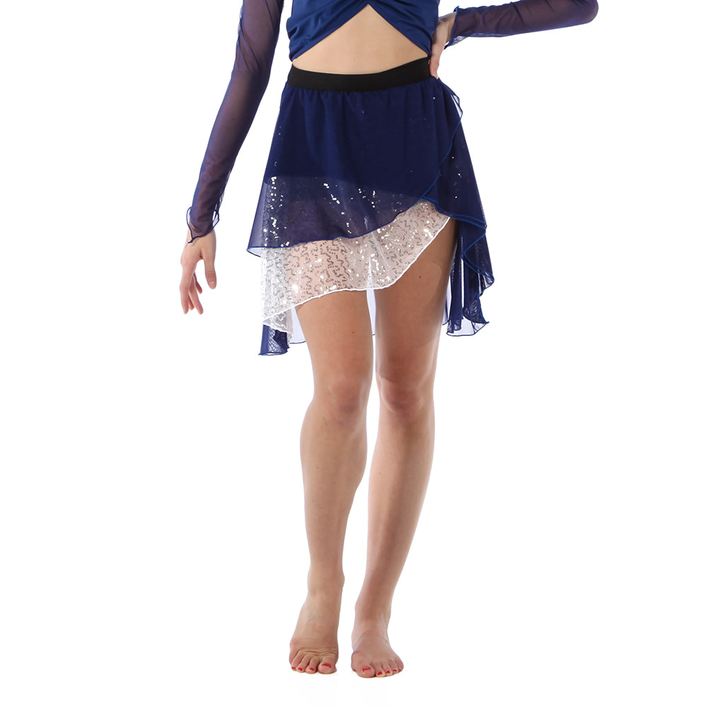 Layered skirt consisting of two navy mesh layers paired with a white sequin layer adds class to a matching sweetheart long sleeve crop top creating the perfect performance duo. Polyester, Spandex.