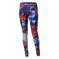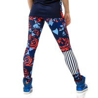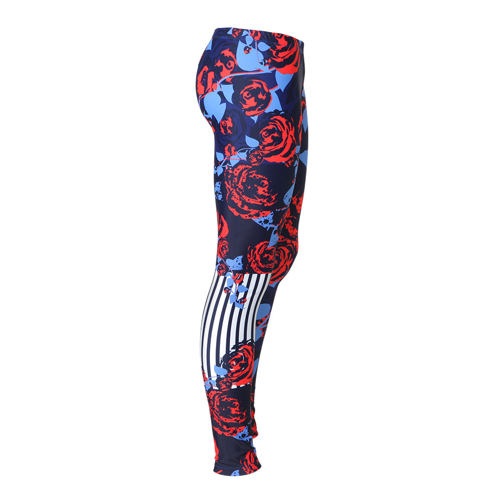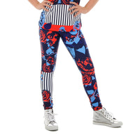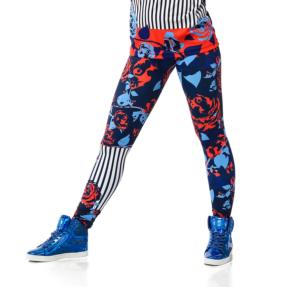 Stylish and hip leggings feature an all-over floral print and stripe design. Vivid color, and supremely comfortable with a covered elastic waistband. Poly/Nylon/Spandex Construction.