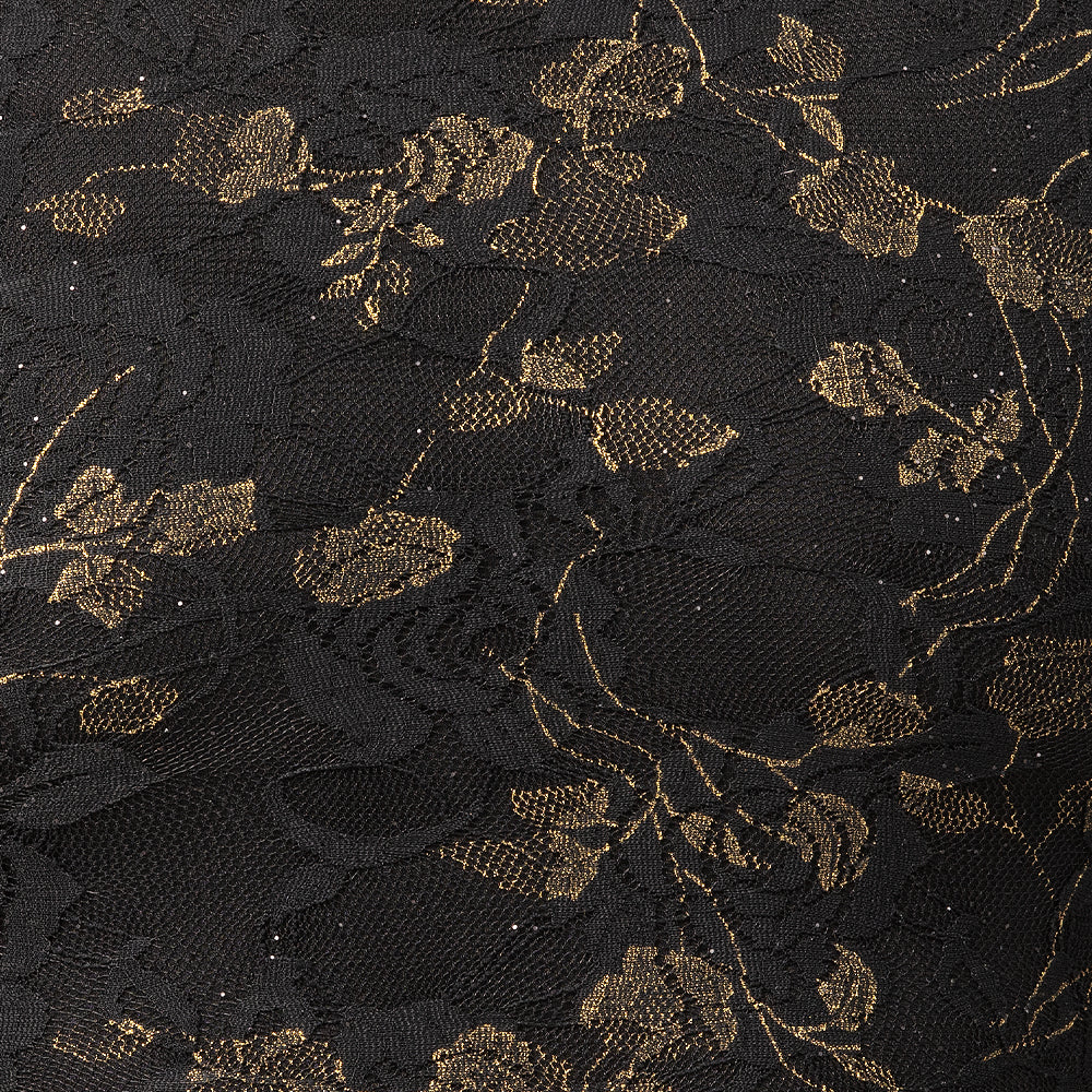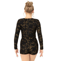 With an all-over floral gold foil print on a black lace fabric, this biketard is what your dancers need to stand out from the competition and shimmer under any stage lights. The biketard consists of set-in long sleeves, circle neckline, fully lined with black tricot for full coverage. Keyhole with a g-hook and center back zipper closure. Polyester, Spandex.