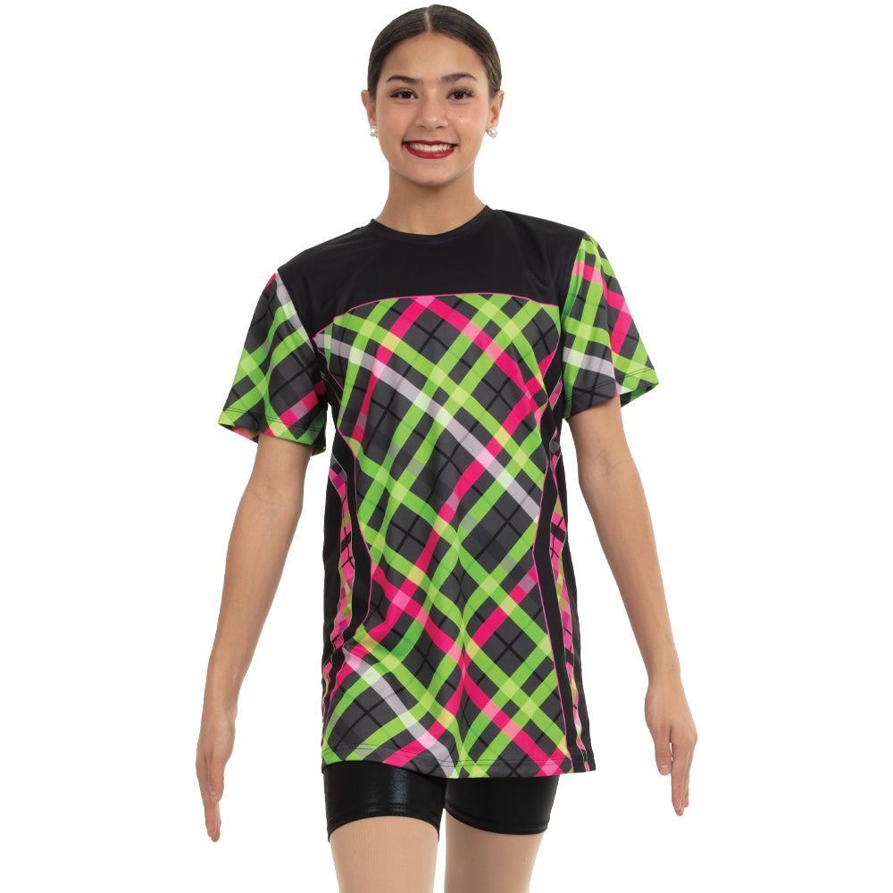 Go fast and take chances in this neon pink and lime green plaid short sleeve shirt. Birds eye mesh fabric. Polyester.