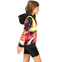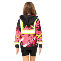 This hiphop sweatshirt was inspired by construction apparel with a twist. Made with an abstract construction graphic dye-sub design. Hooded, Unisex Relaxed fit. Fleece brushed back fabric. 85% Polyester, 15% Spandex.