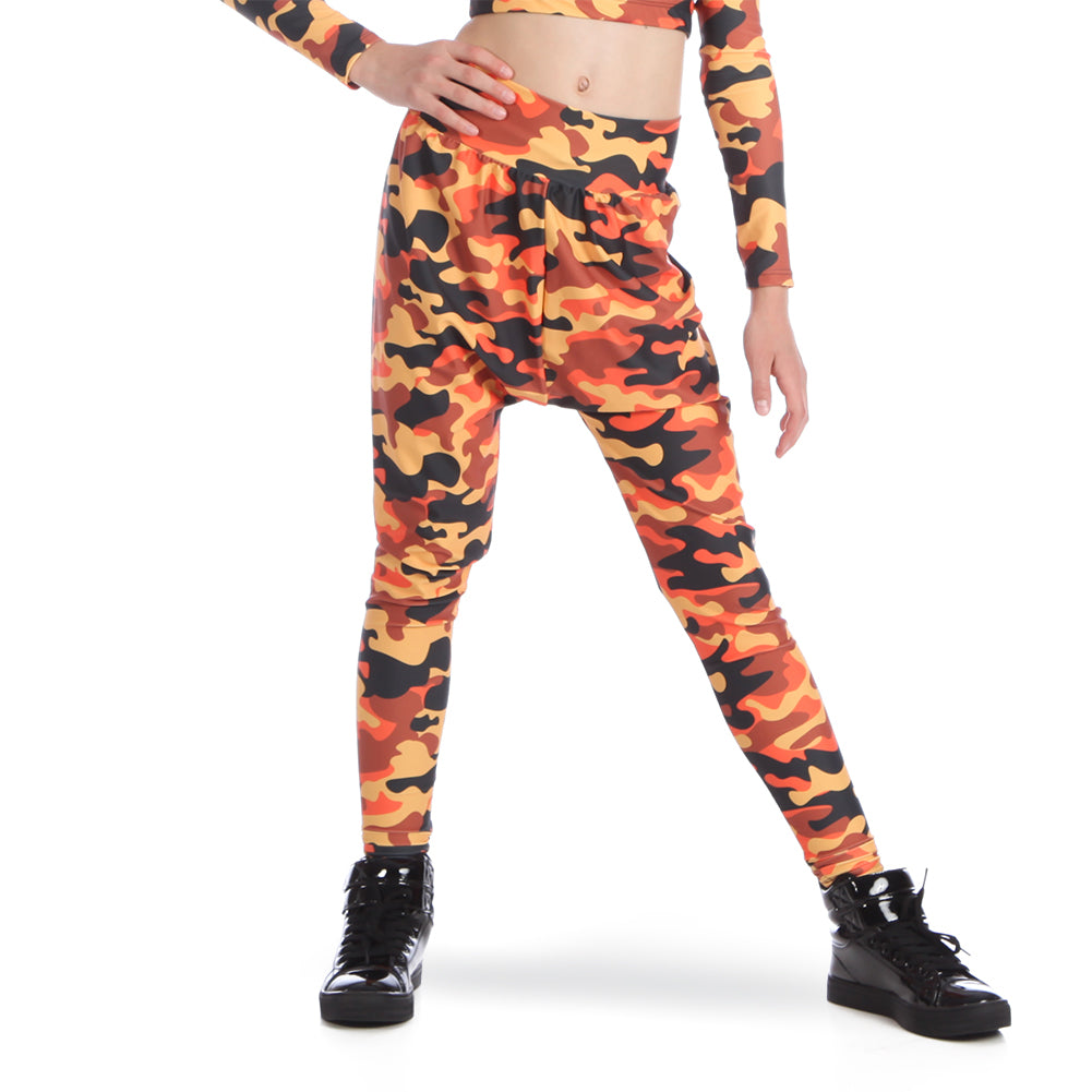 The Orange Camo Harem Pant is the perfect pant for a hip-hop routine. These are edgy and will leave a statement on the dance floor every time. Wear high waist or folded. Polyester, Spandex. Made in the USA.