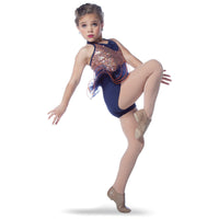 This youth halter biketard features a tricot gathered front bodice with a plunge sequin overlay panel, tricot shorts and back for comfort. Accented with a side bustle.Ā
