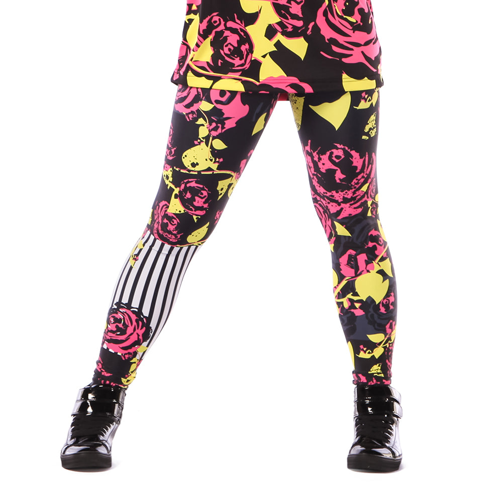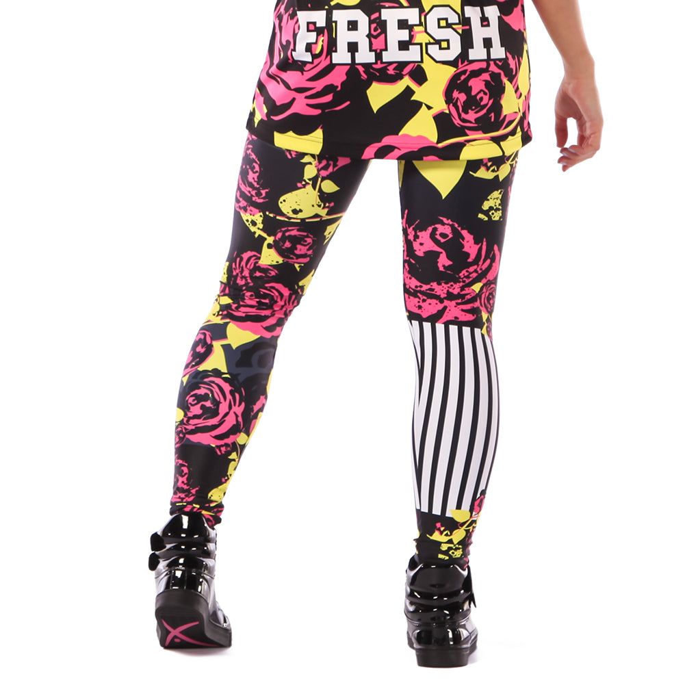 Vivid and fresh all-over floral print and stripe design legging. Elastic waistband. Polyester, Spandex.