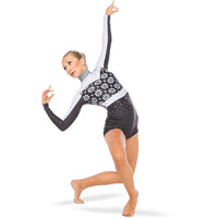 Dazzling Darling Performance Dance Costume Biketard is a flattering, form-fitting, long-sleeve dance biketard, featuring a detailed, intricate dye-sublimated Floral print that will never peel or crack. Zip-Up back. Polyester, Spandex.