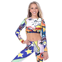 Long-sleeved crop top features vibrant colors and design, with a slight scoop neck front. Polyester, Spandex.