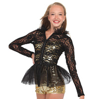 The Alexandra CollectionĀ Lace Peplum Jacket is a long sleeve top that features a peplum tulle hemline, a lace upper half with tulle neckline and an exposed zippered closure down the center. Fabric: Polyester, Nylon (tulle). Colors: Black. Adult Sizes. Runs small.