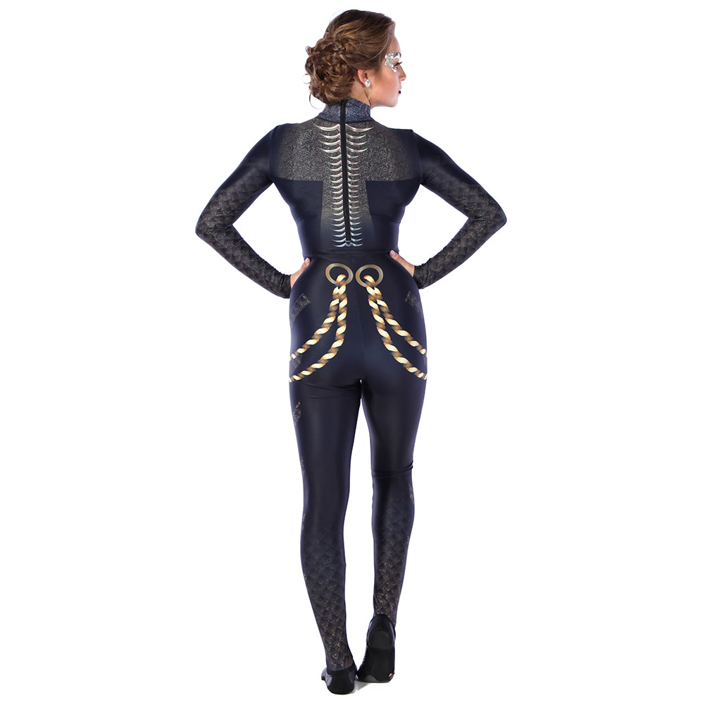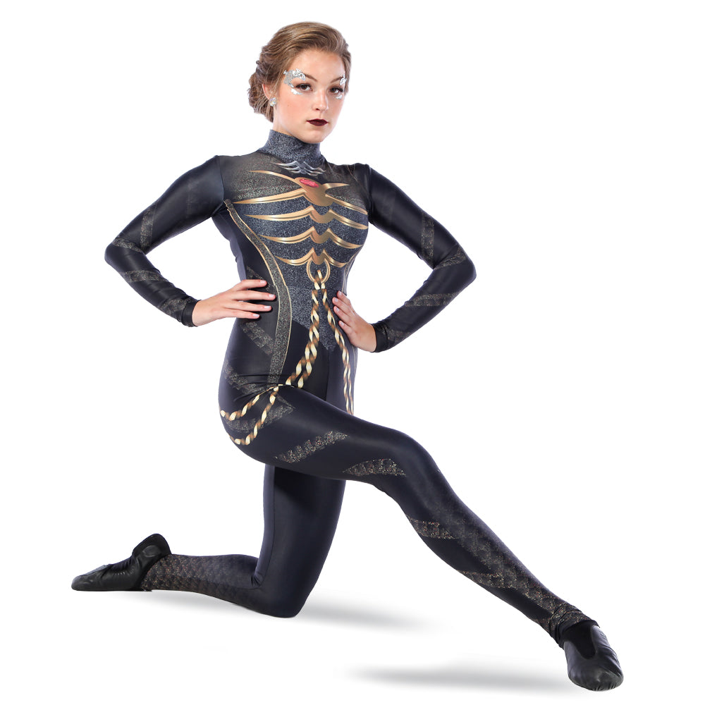 Shine bright like the constellations in the northern sky in this long sleeve mock neck dance costume with center back zip. The unitard is decorated with a modern twist of regal elegance with golden, futuristic embellishments. Full front lining. Ā Polyester, Spandex.