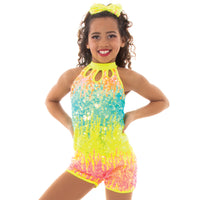 Halter biketard features oval cut outs, a mock neckband, and neon ombre sequin fabric. Binding around armhole and leg opening. Adjustable spaghetti straps with a g-hook closure. Fully lined. Nylon, Spandex.