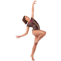 Take the audience by storm in this regal cap sleeve leotard. This leotard features an open mesh back, an allover floral and gold sequin placement dye-sublimated print. Polyester, Spandex. Power Mesh.