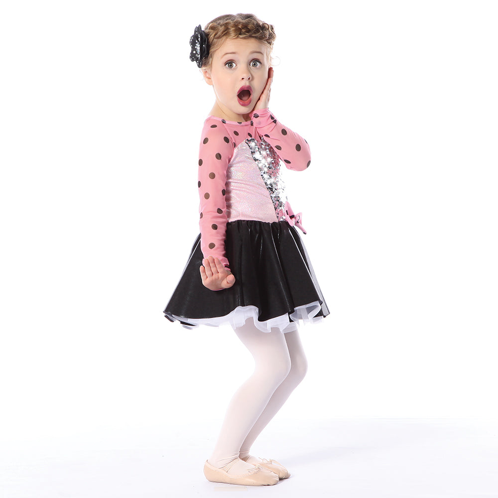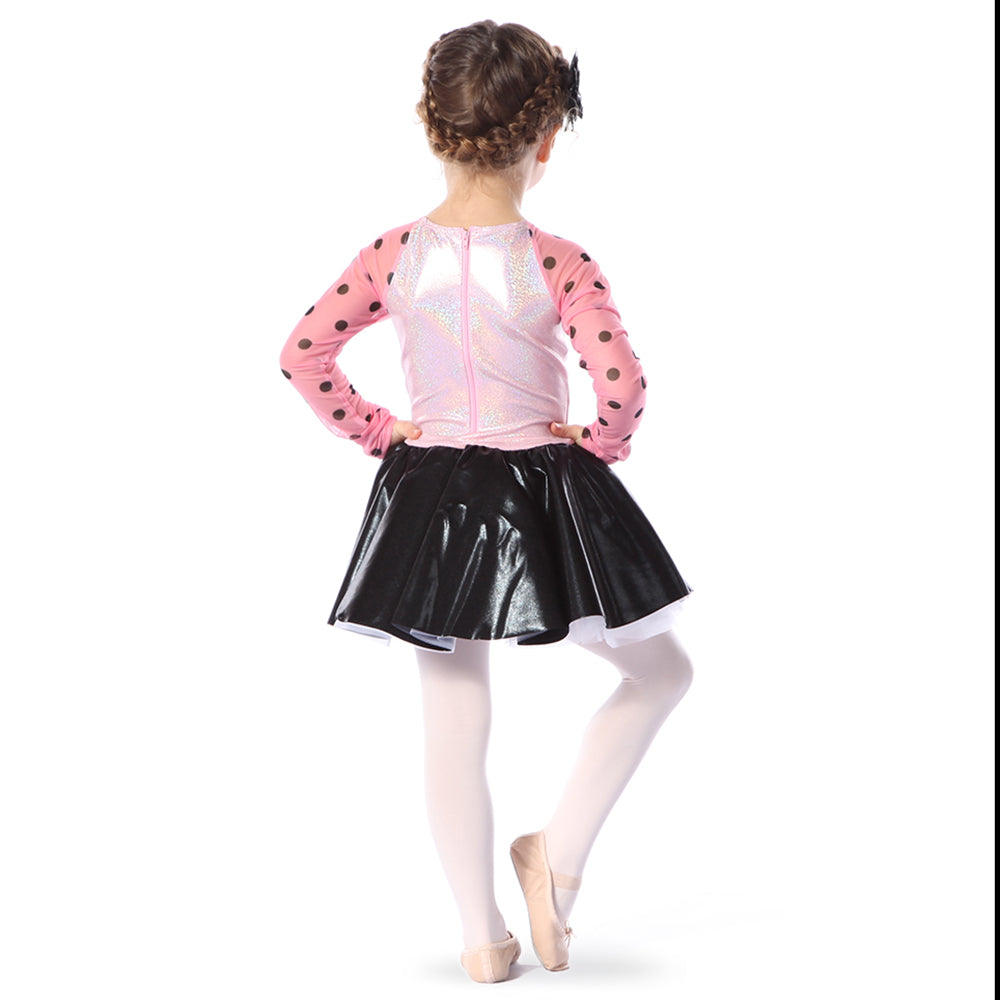 This retro look has a modern twist in this light pink and black polka dot skirted leotard. The upper body and sleeves feature light pink and black dye-sublimated power stretch mesh. The center front silver sequin panel is offset with light pink stretch foil and a mystic black foil skirt. Front bodice is lined. Center back zipper.