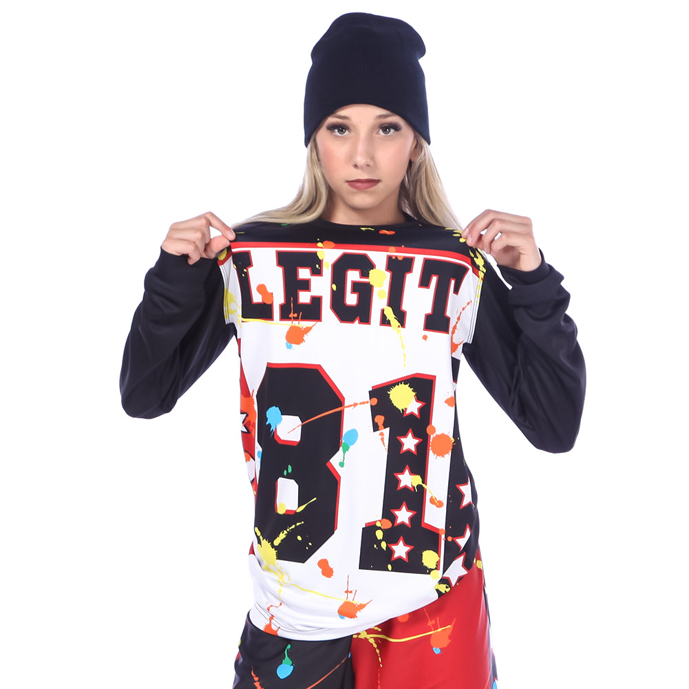 Bring the high energy with this paint splatter inspired long sleeve shirt. Ā All-over paint splatter print on the front with the word āLEGITā and number ā81ā. Ā Solid black back. Lightweight. Flex Fiber Mesh.
