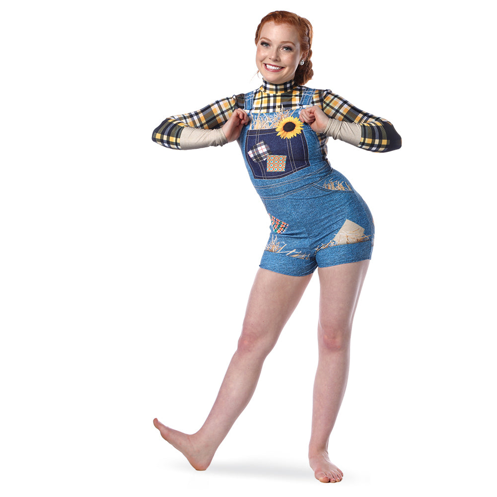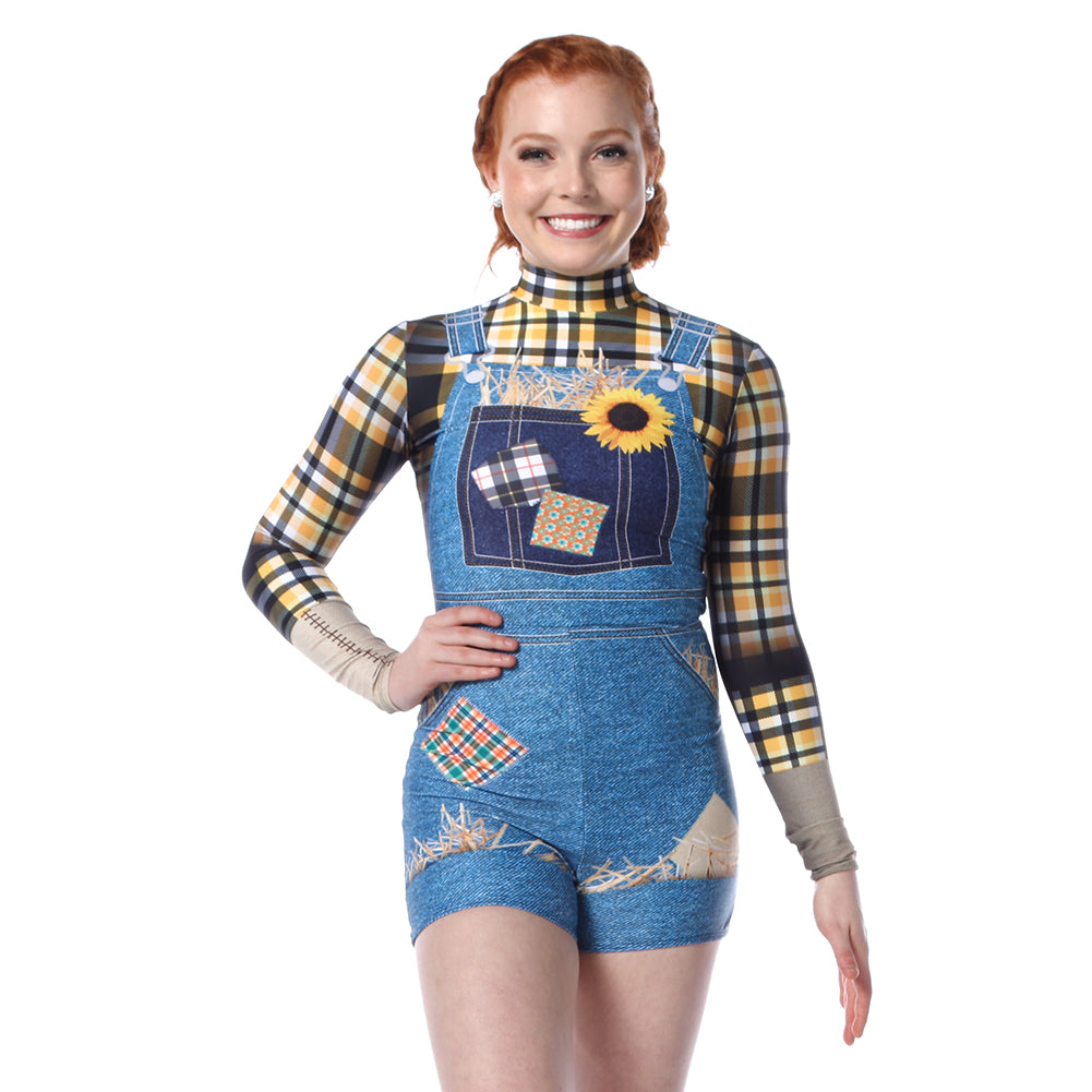 The Scarecrow of Oz Biketard is perfect for your next trip through the Wonderful Land of Oz. This long sleeve mock neck biketard features a unique plaid, realistic denim, patches, sunflower, and straw. Center back zipper closure. Polyester, Spandex. Made in the USA.