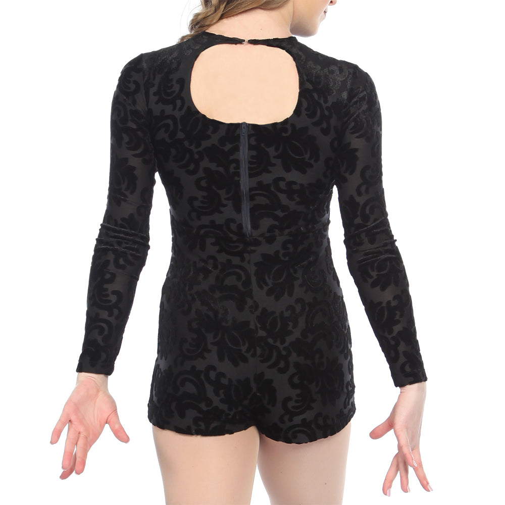 The all-over floral burnout velvet fabric adds a luxurious feel to this biketard. The keyhole back biketard consists of set-in long sleeves, circle neckline, fully lined with black tricot for full coverage. G-hook and center back zipper closure. Nylon, Spandex.