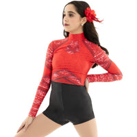The ombre color block criss-cross panels add just the right amount of visual effects to your next performance. Mock neck collar, full front lining and a center back zipper. Polyester, Spandex.