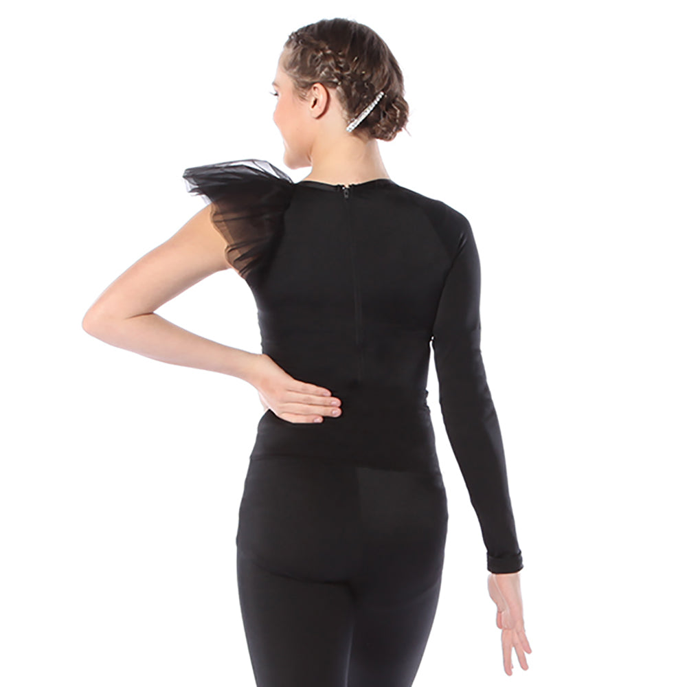 This sweetheart biketard has just the right amount of bling for your next performance. The front bodice consists of a multi-color mermaid stretch sequin on black mesh foundation fabric and black tricot bound sweetheart neckline with asymmetrical sleeves. One long black tricot sleeve and one puff black organdy flutter sleeve. Black tricot bottoms and back with center back zipper.Ā Upper front lined.