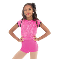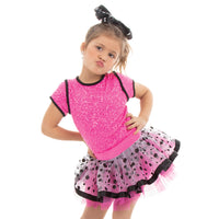 Clap your hands and get ready to dance in this dazzling costume. This sequin bodice biketard has accented black tricot binding at the armhole, neckline and hem at the cap sleeves for comfort and design. Pink tricot short bottoms and back. Zipper back closure. Pair with the shimmer polka dot tulle skirt with enclosed tricot waistband for the perfect look.