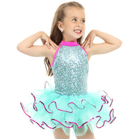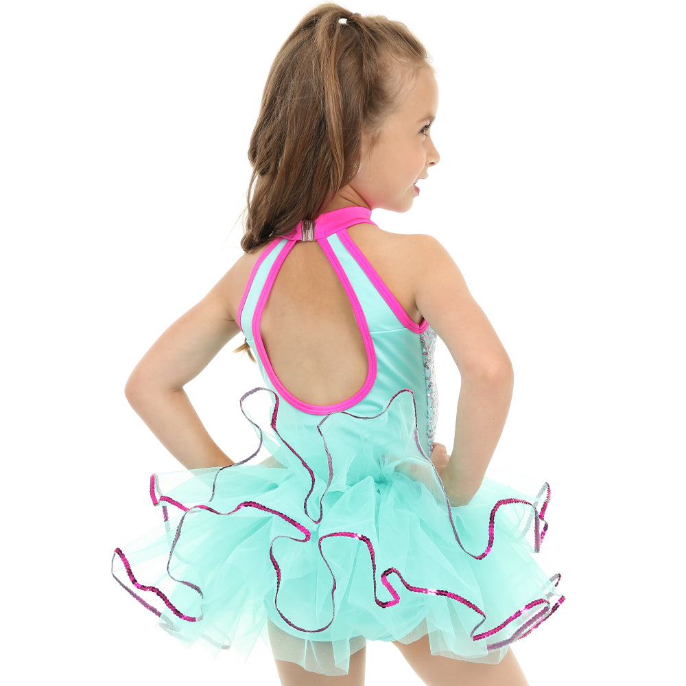 Costume features a 3-layered glitter tulle tutu, sequin bodice and an open keyhole back with a g-hook closure. Fully lined with binding around the neckline and armhole. Polyester, Nylon.