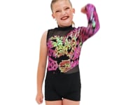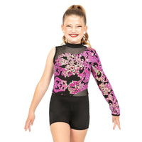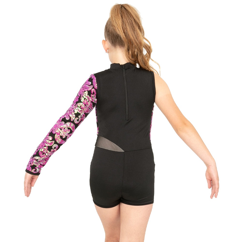 Radiant the stage with this asymmetrical floral sequin biketard. The asymmetrical sequin sweetheart neckline is offset with an upper and lower illusion mesh panel and one long floral iridescent sequin tricot sleeve. The sleeveless armhole is finished with tricot binding for comfort. Black tricot stretch shorts. There is a mock neckband with a center back zipper closure. The bodice is fully lined behind the mesh and sequin panels. The sleeve is not lined.