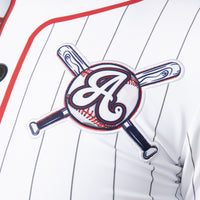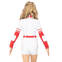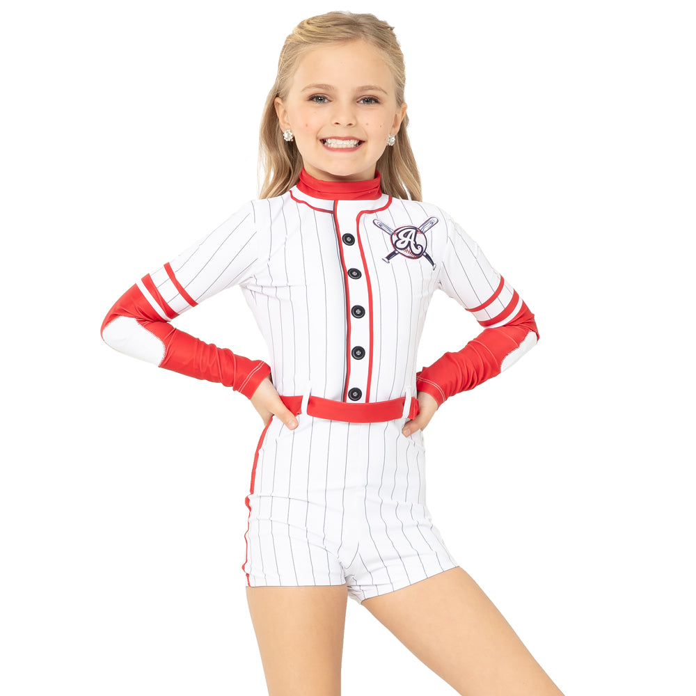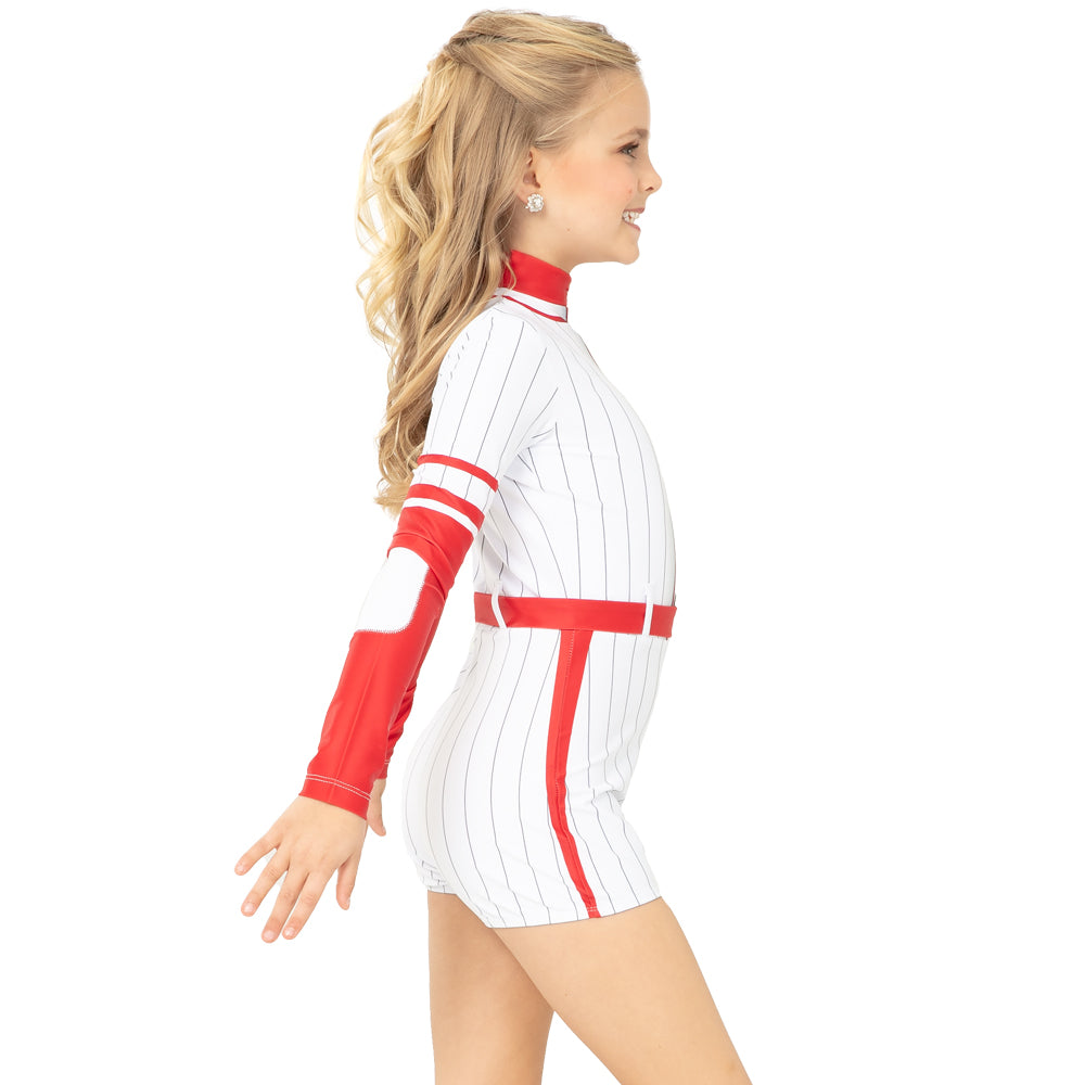 This Baseball Strike Out baseball biketard is a must. It is designed with pinstripes graphic detail that is offset with real elbow patches, embroidery front chest patch ' A' , along with a belt and belt loops to finish the costume. This costume would look amazing rhinestoned. Mock neckband with center back zipper closure, Lined.