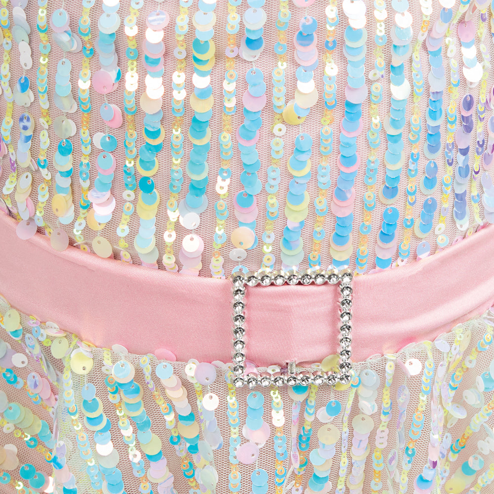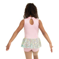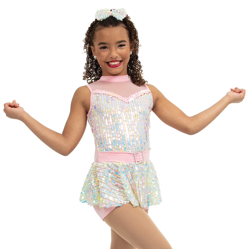 This eye catching skirted biketard is perfect for your next performance. The illusion mesh panel with sweetheart irridescent vertical sequin bodice pattern is accented with sequin trim. Tricot keyhole back, mock neckband and shorts. Binding around armhole for comfort. Center back g-hook closure.