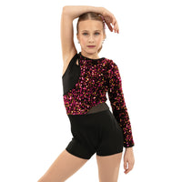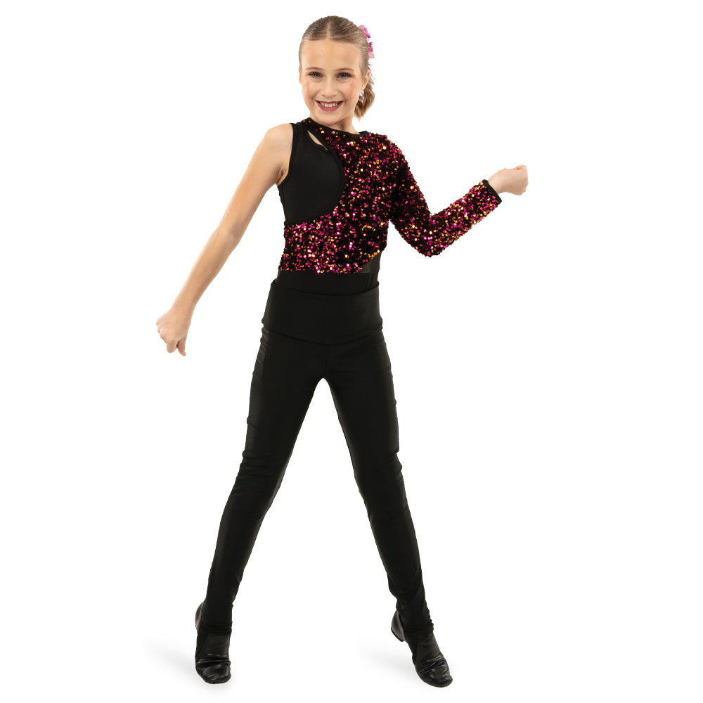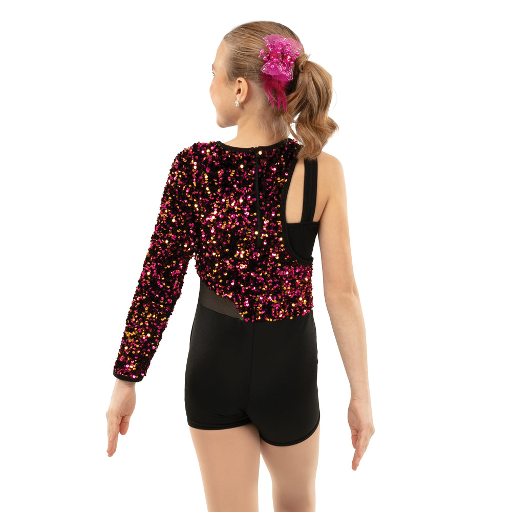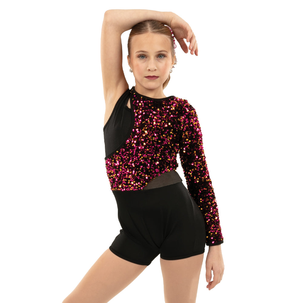 This asymmetrical sequin panel biketard is offset with a keyhole detail tricot panel and mesh cutout side panel. The pink and gold sequin is on a black velvet fabric. Binding along the neckline and sleeve opening for comfort. Centerback zipper closure. Black tricot bottoms.
