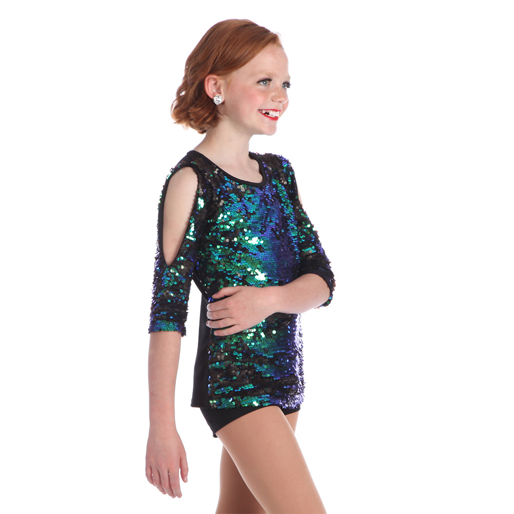 Get ready for a standing ovation with this open cold shoulder three-quarter length sleeve sequin top. This top features a slight scoop neckline, iridescent teal sequins that change color as you dance in the spotlight. The reverse side of the sequins is matte black. Solid Black tricot back. The front bodice and sleeves are lined for comfort and to protect the skin from scratching. Polyester, Spandex.